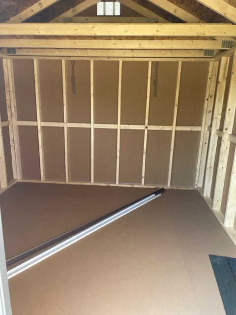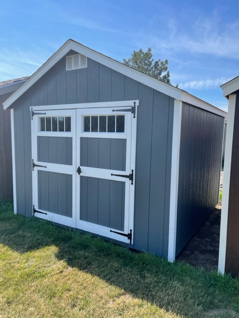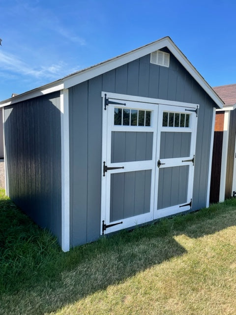 10×10 Alpine Gable, 3/4″ LP Pro Struct Floor, 6×12 Pitch, 72″ Double Doors W/Transom Windows, 4″ Loft, Gray Siding, White Trim and Alpine Black Shingles