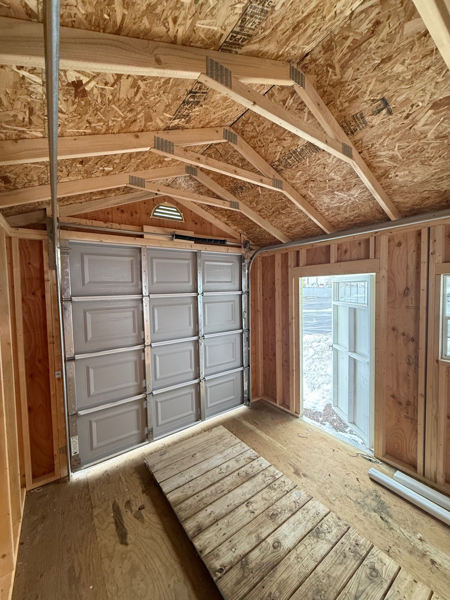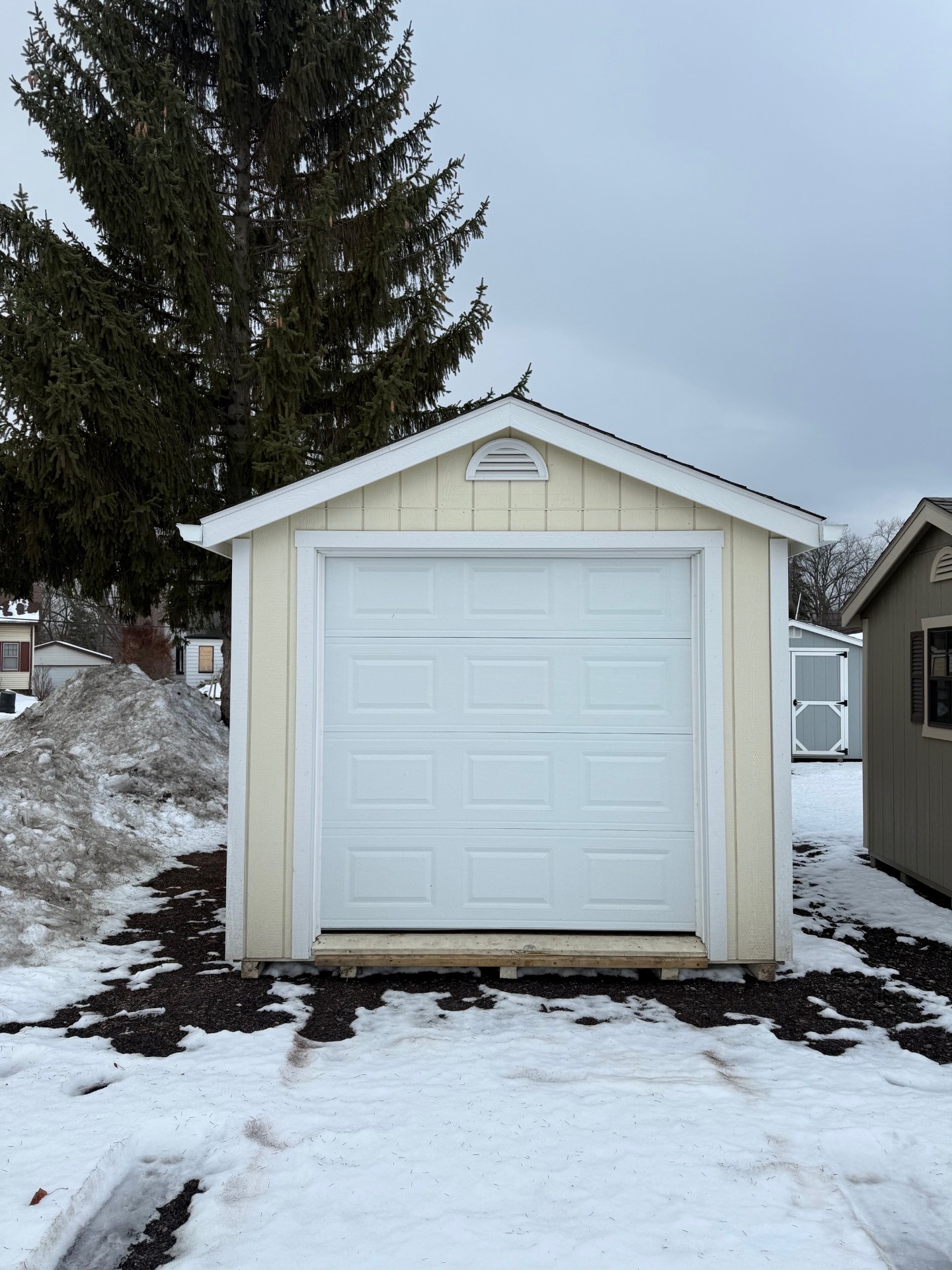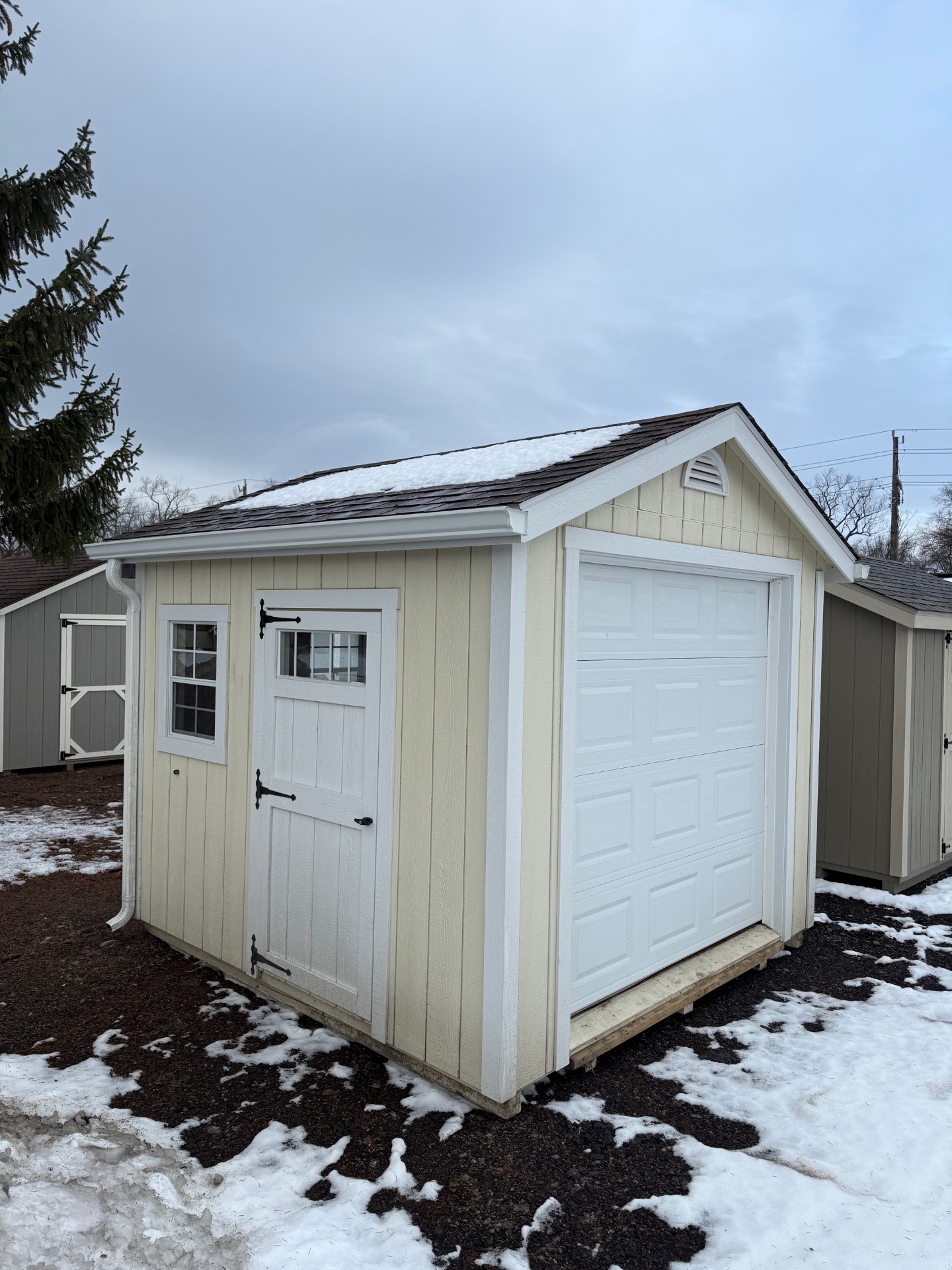Designed with both convenience and durability in mind, this model includes a sectional garage door, allowing wide and easy access for lawn equipment, motorcycles, tools, or workshop use. A stylish 9-lite side entry door adds additional accessibility while allowing natural light into the interior.