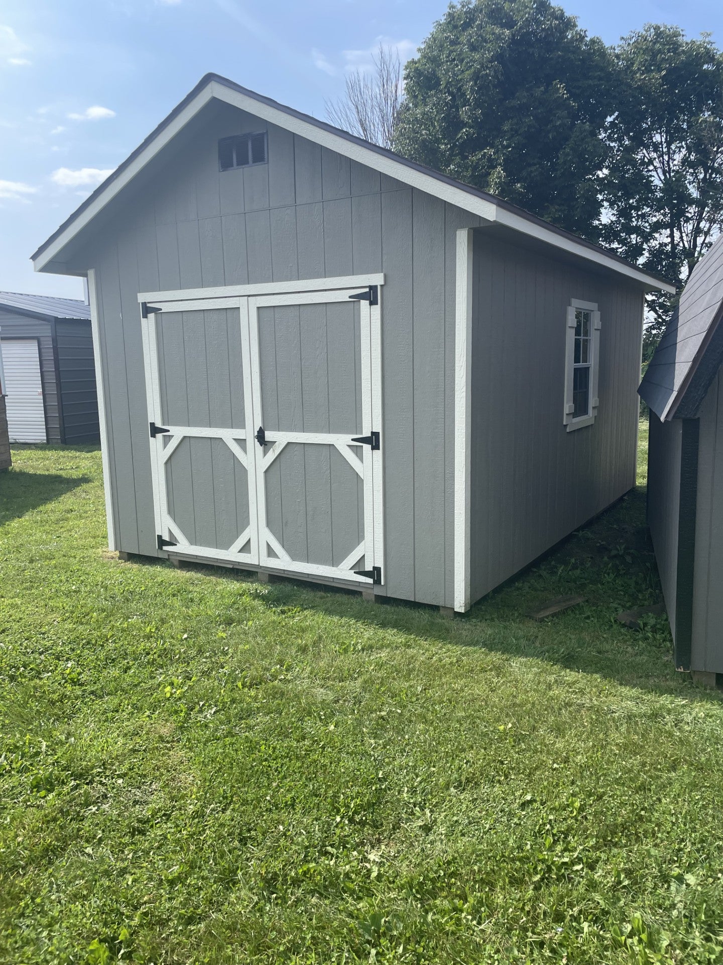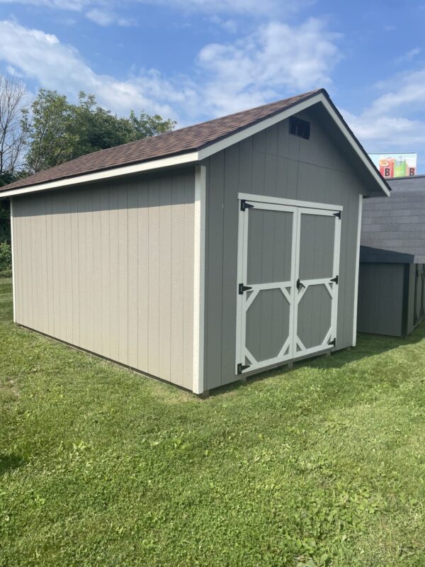 10×16 Alpine Gable, 12″ Overhangs, 3/4″ Pro Struct Floor, 6/12 Roof Pitch, 72″ Double Doors, 24″x36″ Window, Bar Shutters, Clay Siding, Navajo Trim,