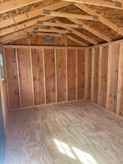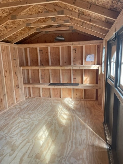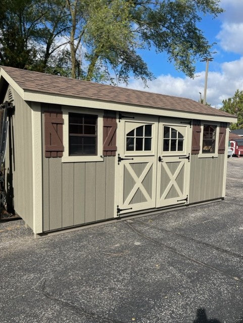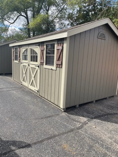 Upgrade your outdoor workspace with the 10×16 Deluxe Cottage Workshop. Featuring durable dual brown shingles and painted clay siding with monteray sand trim, this workshop also includes 3-10×1 shelves and 5×6 double vintage doors for convenient access. With delivery included and flexible financing options, get organized today.