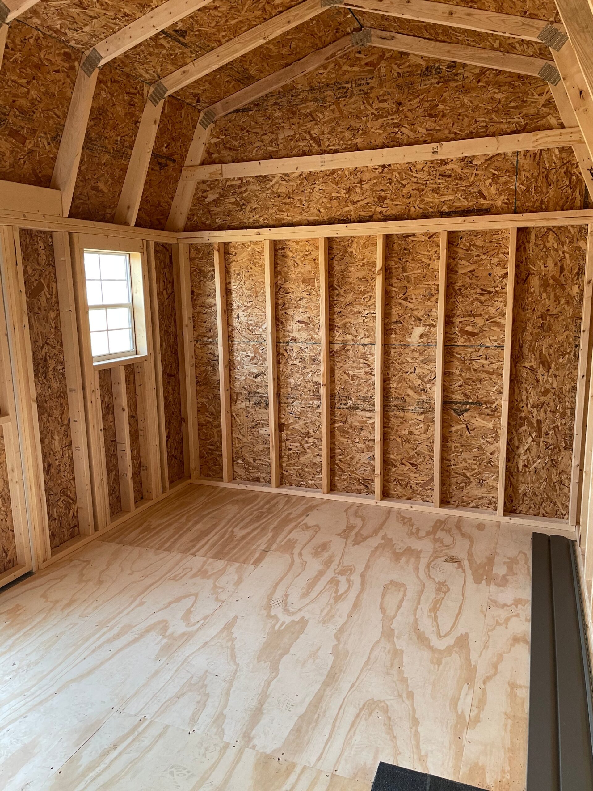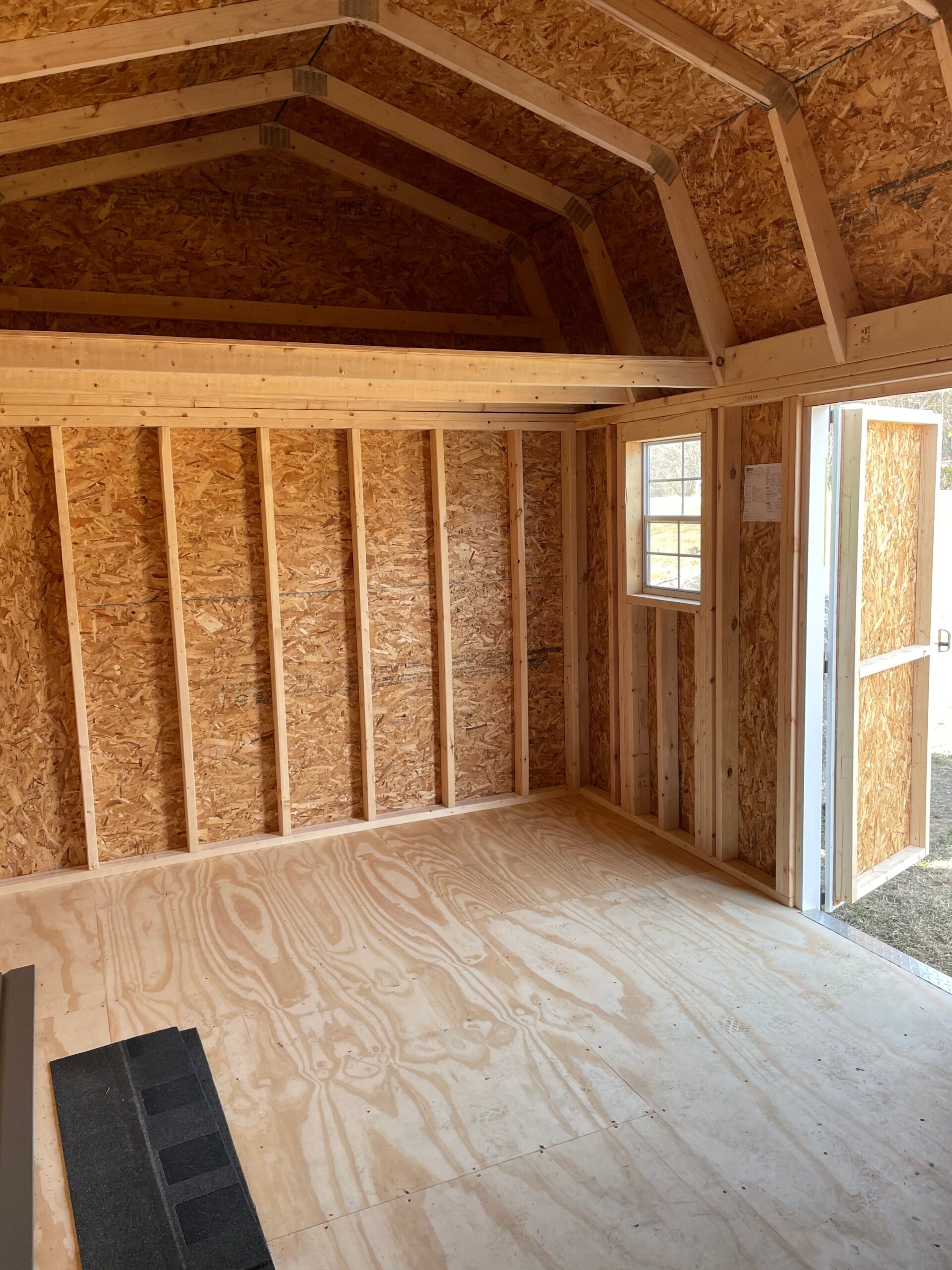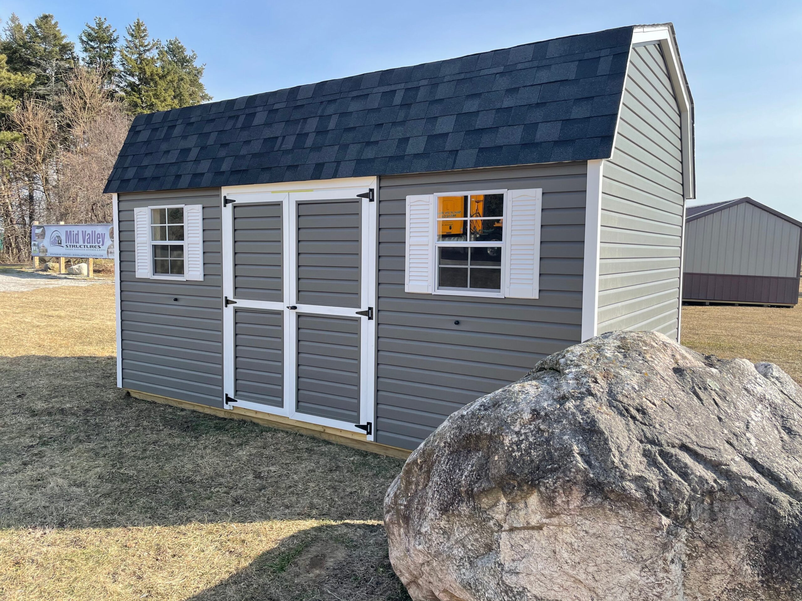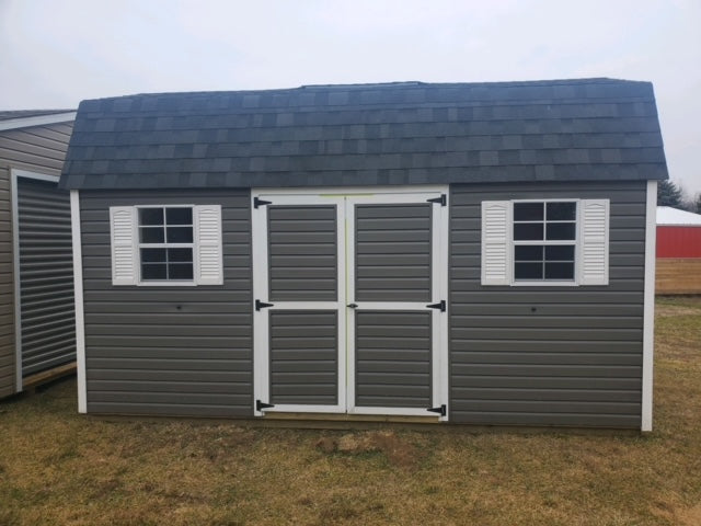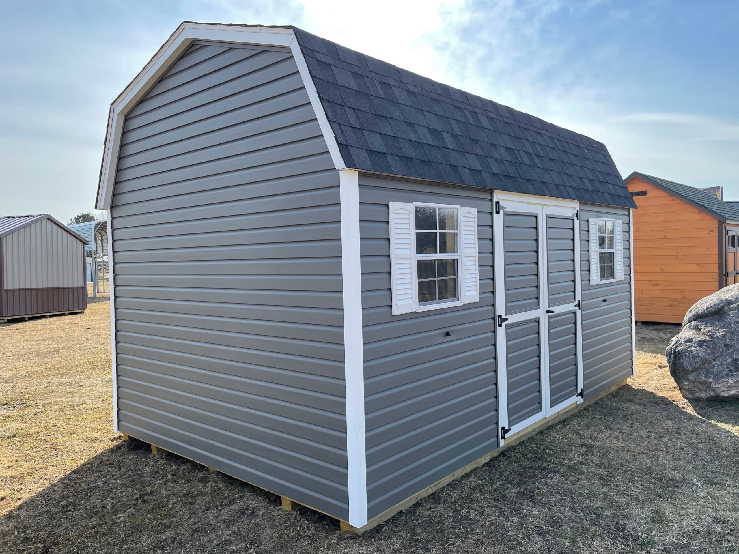 The 10×16 Dutch Barn is equipped with durable Grey Vinyl Siding, a spacious 10×4 loft, and secure 6×6 key locking double doors. It also features 2-21×27 windows with screens and shutters for ample natural light. The 25 year shingles provide long-lasting protection for your belongings. Financing and no credit check rent to own available