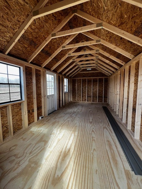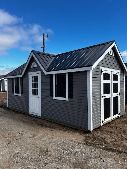 10×20 Deluxe Chalet, Vinyl Siding,Black Steel Roof, 5×6 Double Doors w/Transom Windows, 32″ 9 Lite Pre-hung Door, Ageless Slate Vinyl Siding, White Trim