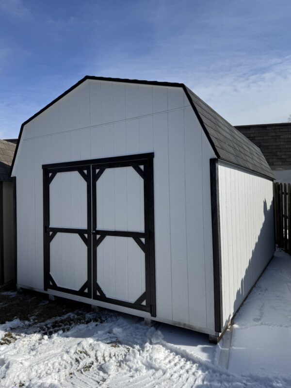 12×16 10ft Pro Series, 4′ Loft 6×6 Double Doors, 4ft Loft, Dual Black Shingles, White Siding and Black Trim, 75 Mile Delivery Included, Financing and Rent to Own Included.