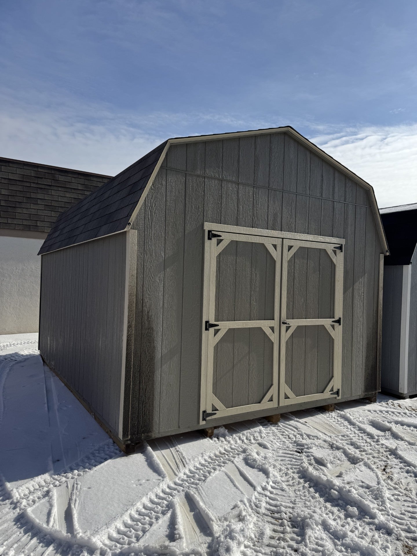 12×16 10ft Pro Series, 4′ loft, 6×6 Key Locking Double Doors, Clay Siding, Almond Trim and Weather Wood Shingles, 75 mile delivery included. Financing and No Credit Check Rent to Own Available