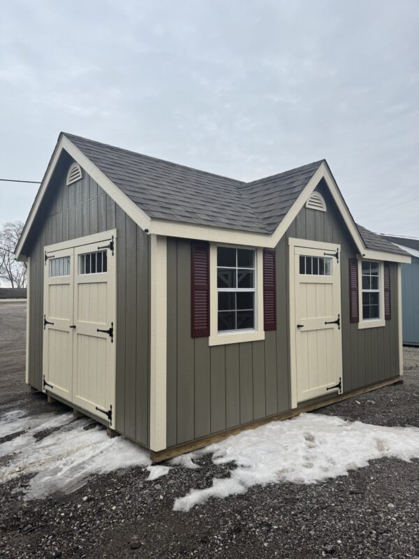This 12×16 Deluxe Chalet features Double and Single doors with transom windows, a Reverse Dormer, and Clay Siding with Navajo White Trim. The striking Burgundy Shutters add a pop of color. The high 8/12 roof pitch provides ample space inside, and delivery is included. Financing and a Rent to Own option with no credit needed are also available.