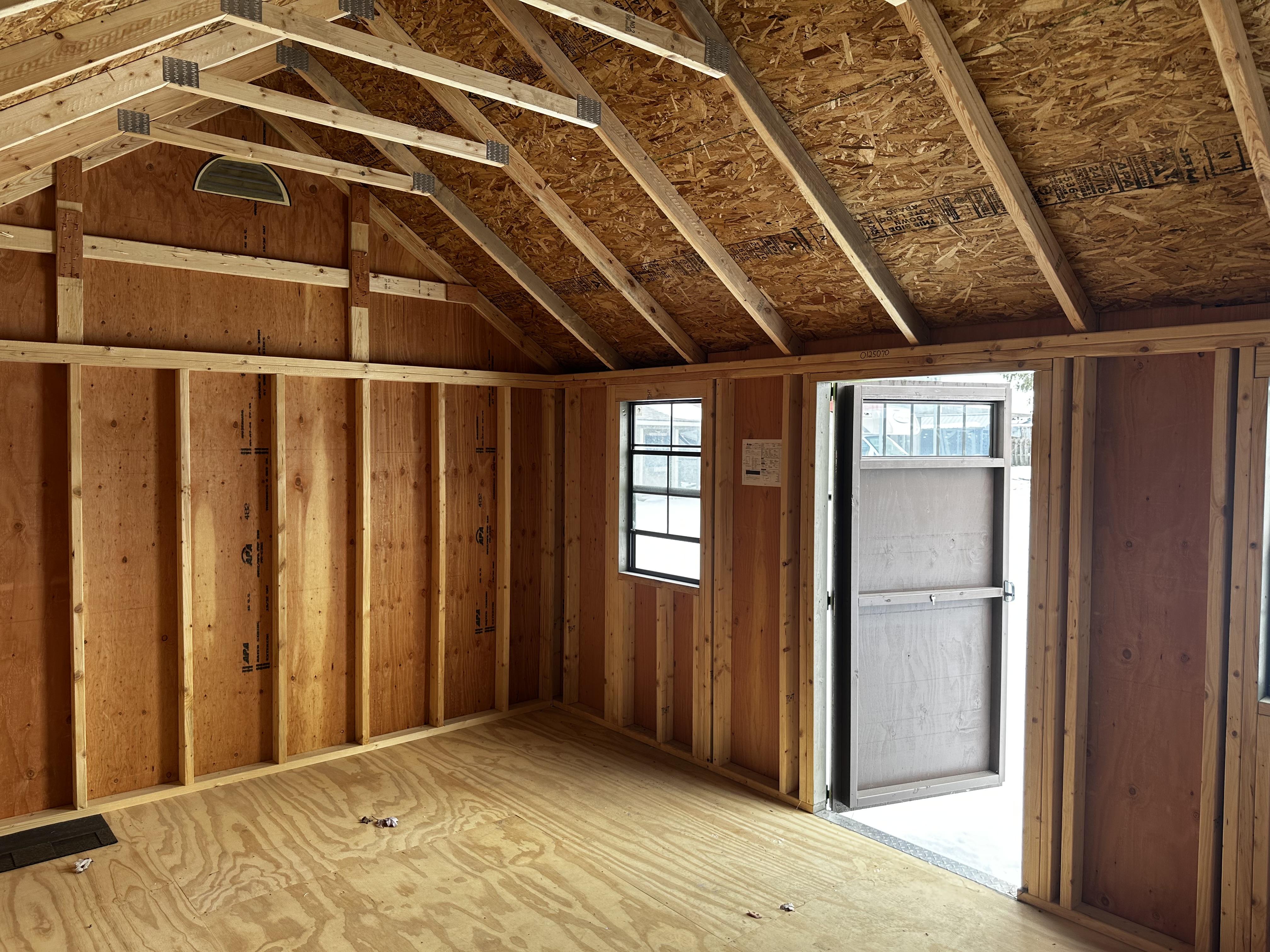 The front includes 6×6 Dura-Temp double doors with transom windows, along with a 36″ single entry door with transom window, allowing even more light into the interior. Two 24×36 windows with screens and slat shutters enhance ventilation and charm, while three half-round vents provide additional airflow.