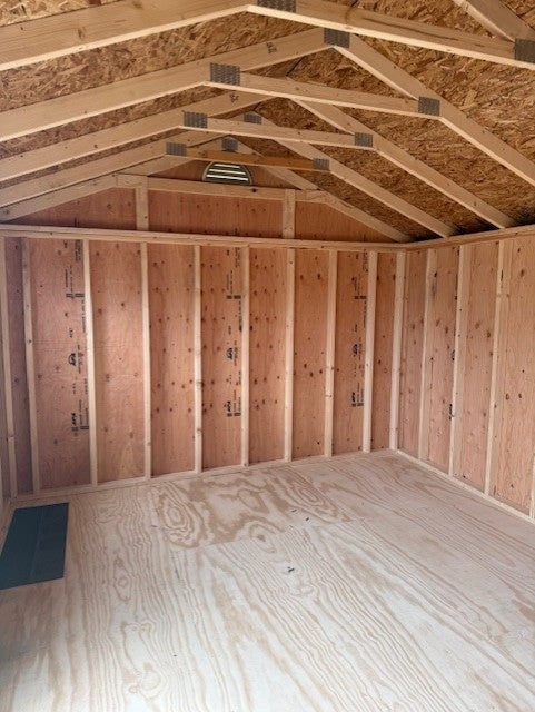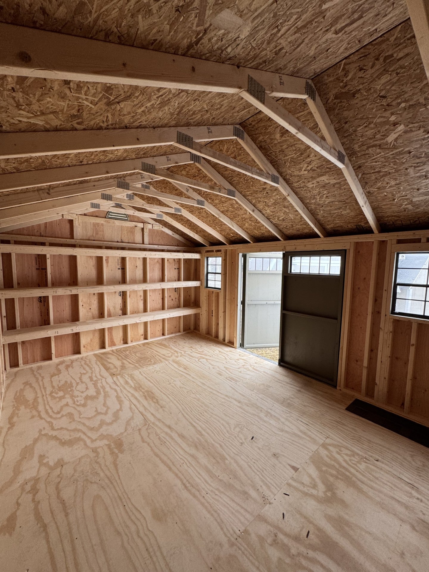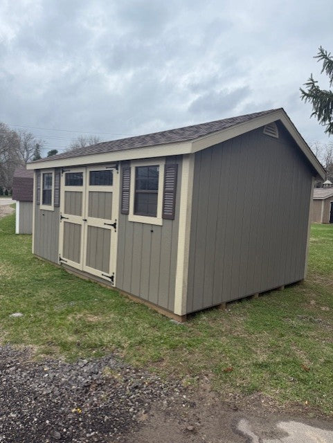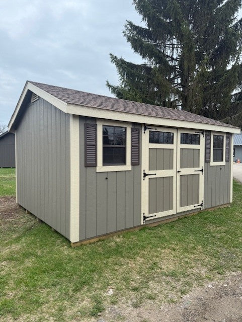 12×16 Deluxe Cottage Workshop, 2-21×27 Windows w/ Screens, 3-1ft Shelves Spaced on End Wall, 6×6 Key Locking Double Doors w/Transom Windows. Dual Brown 30 Year Dimensional Shingles, Clay Siding Almond Trim