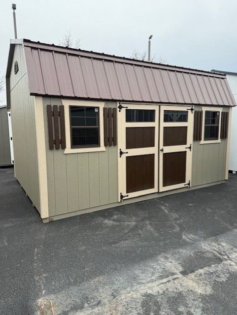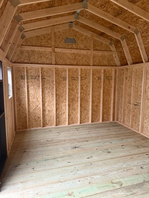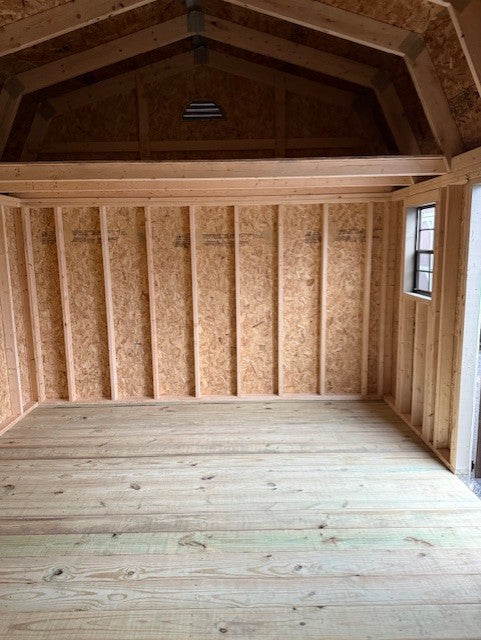 This 12×16 Deluxe Dutch Barn features 2-21×27 windows with screens and shutters, a 2×8 tongue and groove plank floor, and 4′ loft key locking double doors. It also offers financing options with no credit check and the convenience of rent-to-own. Delivery is included.