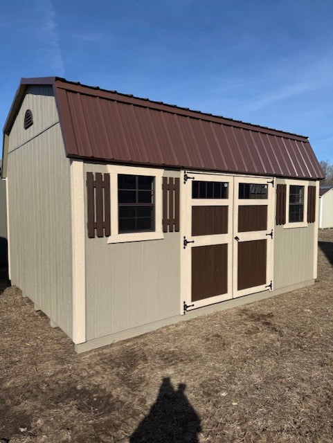 This deluxe Dutch Barn features a painted exterior in a clay color with almond trim. It includes 6×6 key locking double doors with transom windows and 2-21×27 windows with screens, along with a 12×4 loft for additional storage. The brown metal roof adds durability and style to this versatile structure. Delivery included. Financing and no credit check rent-to-own available.