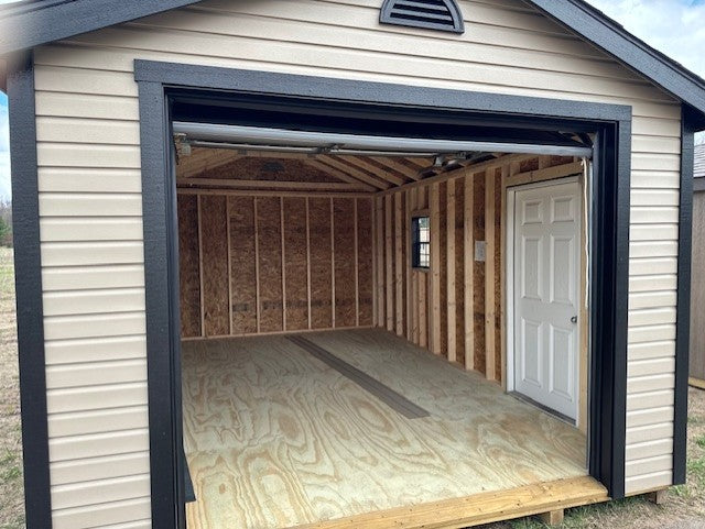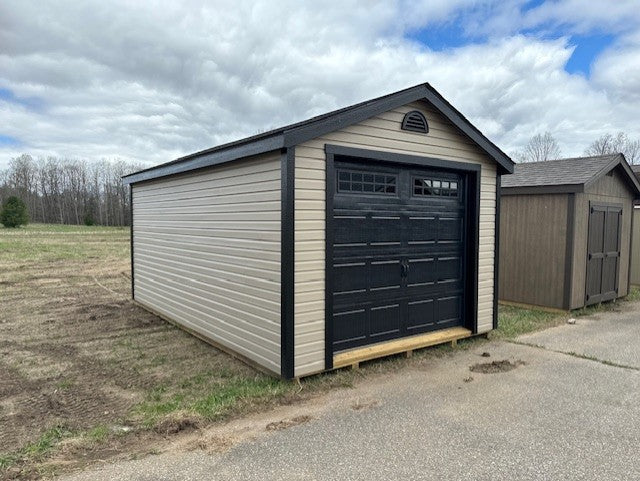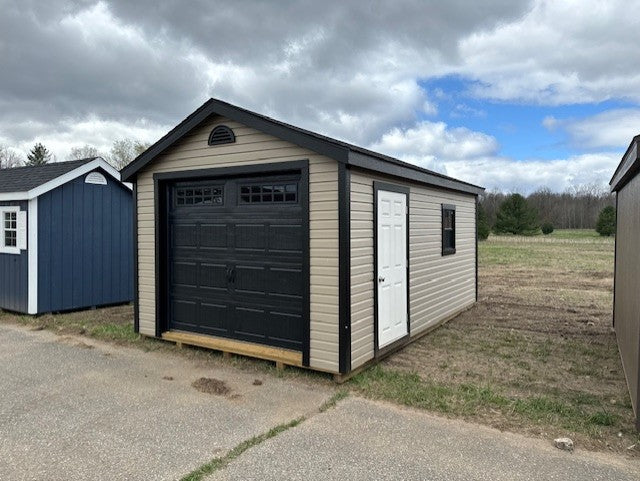 12×16 Deluxe Garage, 8×7 Carriage House Garage Door, 36″ Solid Entry Door, 3/4″ Treated Floor, Dual Black Shingle, Tuscan Clay Vinyl Siding, Black Trim, Financing and No Credit Check Rent to Own Available