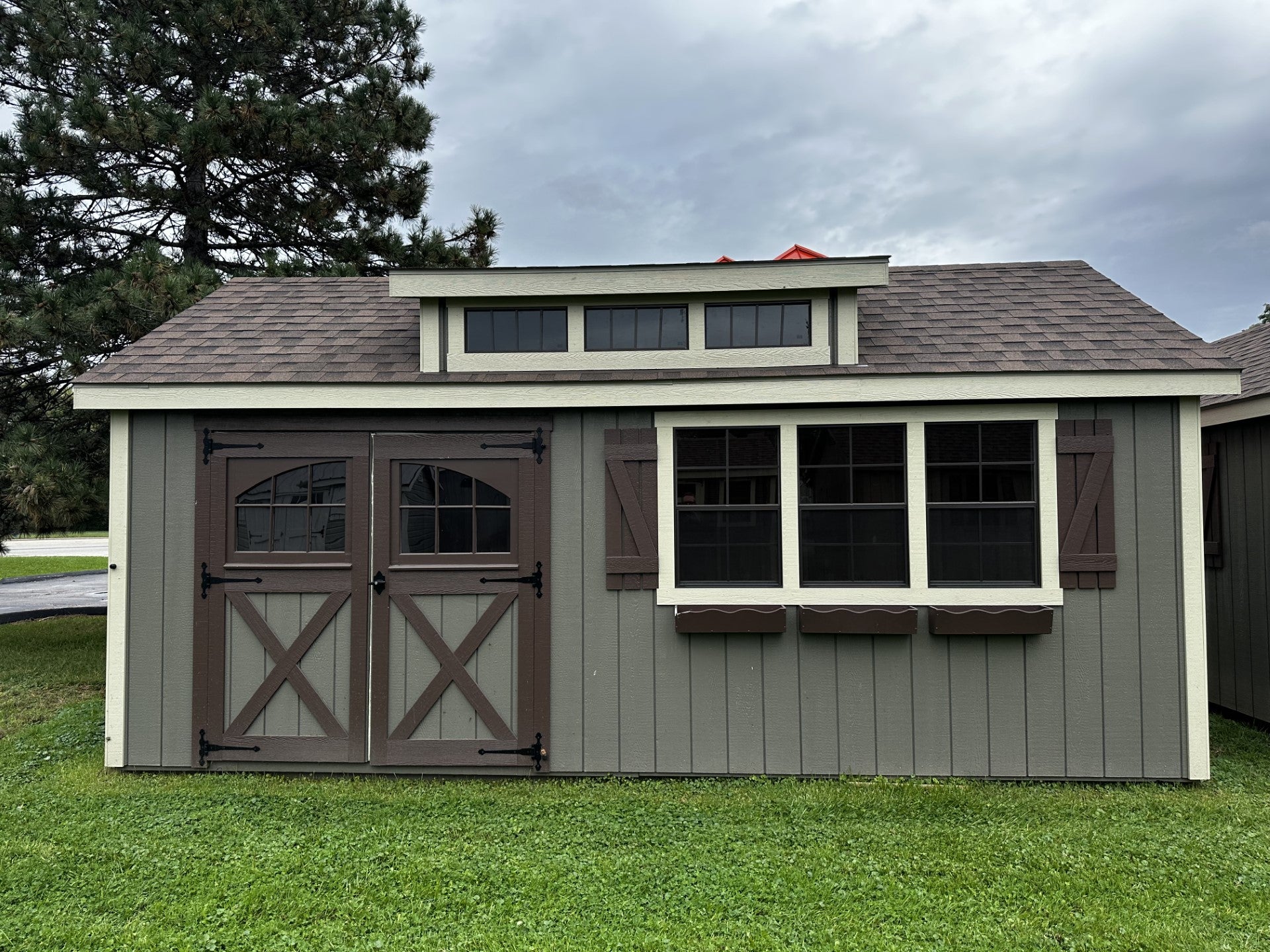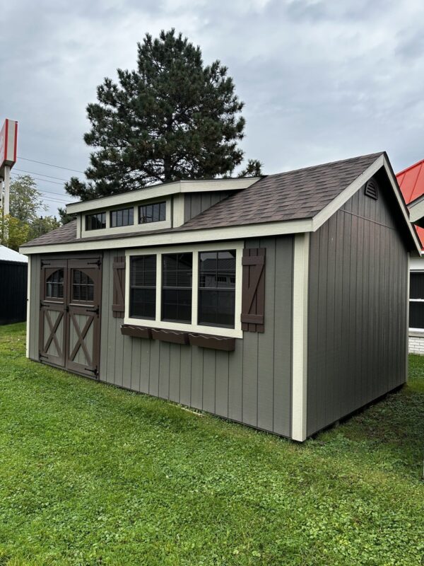 12×20 Deluxe Cape Cod, 6×6 Vintage Double Doors w/Key Locking Handle, 3-Window Dormer, 3-24×36 Windows, Screens and Shutters, w/Flower Boxes, Dual Brown Roof, Clay Siding and Almond Trim.