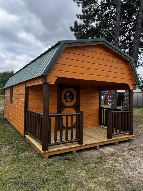 The Gambrel Cabin Series boasts a loft, metal roof, and Tongue and Groove knotty pine siding. Enjoy a 6 ft porch with cedar rails and posts. Plus, delivery is included and financing and rent to own options are available.