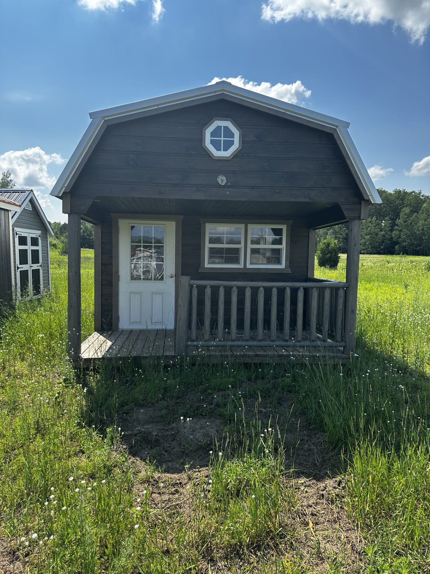 This 12×26 Gambrel Cabin offers a cost-effective solution for a small cabin or storage space. Featuring tongue and groove pine siding, a 6ft gable porch, and included delivery, this repo unit is partially finished and ready for the perfect touch of TLC. Take advantage of our financing and rent-to-own options for added convenience.