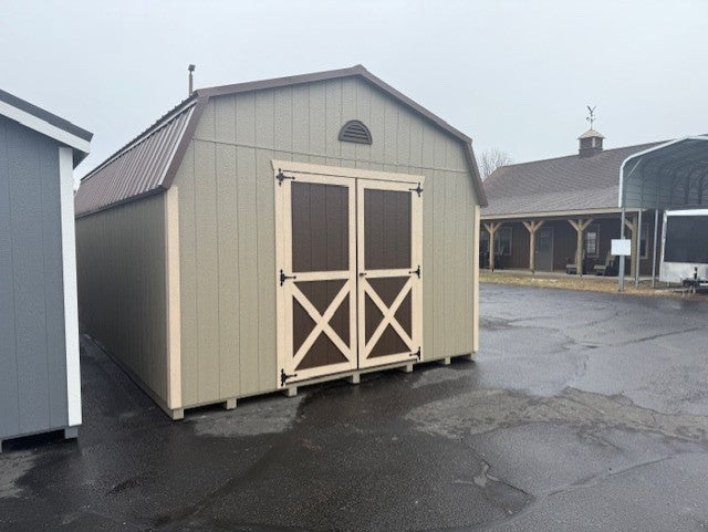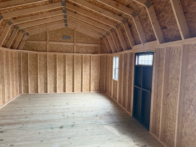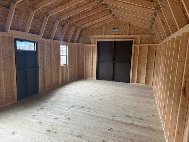 This 14×24 Deluxe Dutch Barn offers 7′ tall double doors, 36″ entry doors, 2-24×36 windows with screens and slat shutters, and a metal roof. The 2×8 tongue and groove treated floor provides durability. Rent to own and financing options available, plus free delivery. Get your dream barn today!