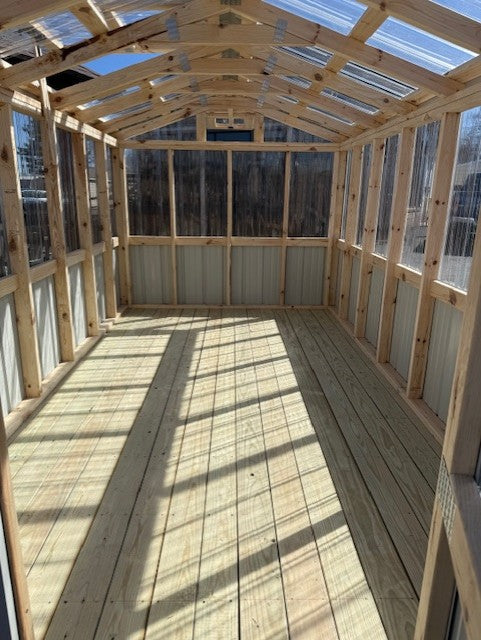 This 8×14 Green House features white steel siding and poly carbonate sides and roof, providing durability and natural light for your plants. With pop up vents and a key locking entry door, this greenhouse offers both functionality and security. Perfect for any avid gardener or plant enthusiast. Financing and No Credit Check Rent to Own Available
