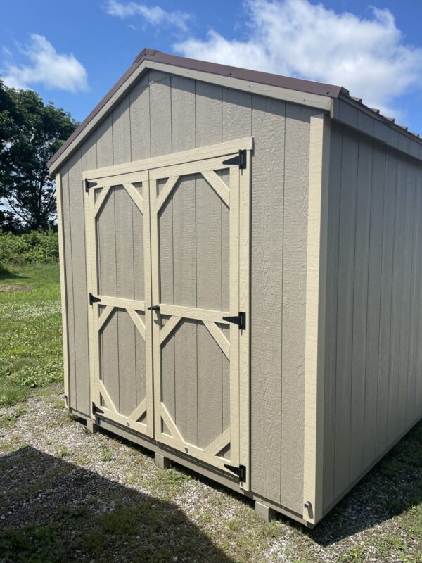 8×8 Pro Cottage Workshop, 56″ Double Doors, Brown Metal Roof, Clay Siding, Almond Trim
