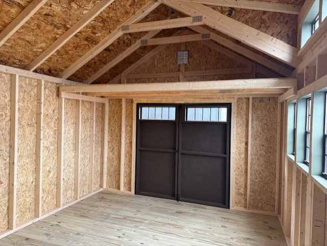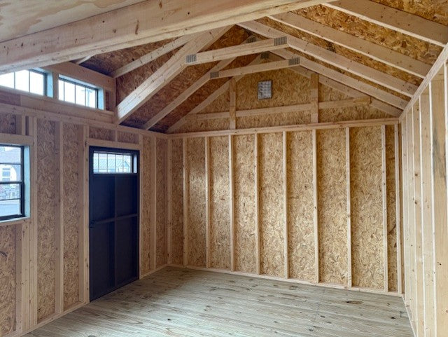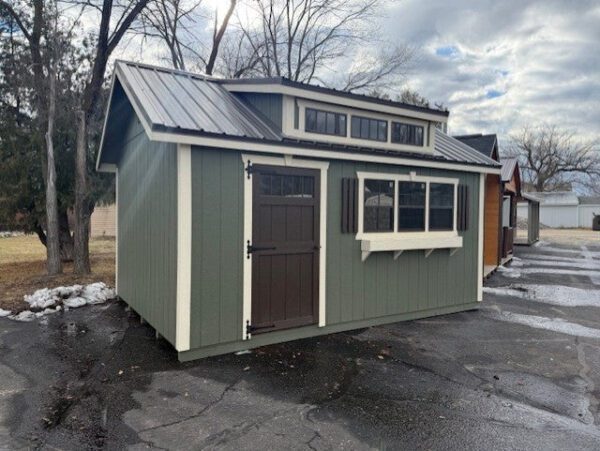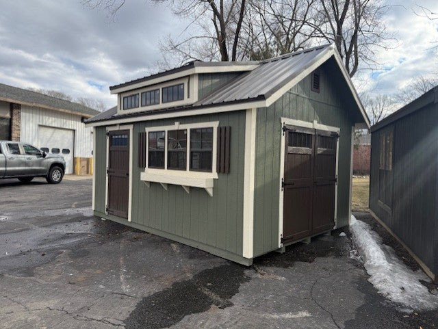 12×16 Deluxe Cape Cod with 3 window dormer and steel roof, flower boxes and Duratemp doors with transom windows